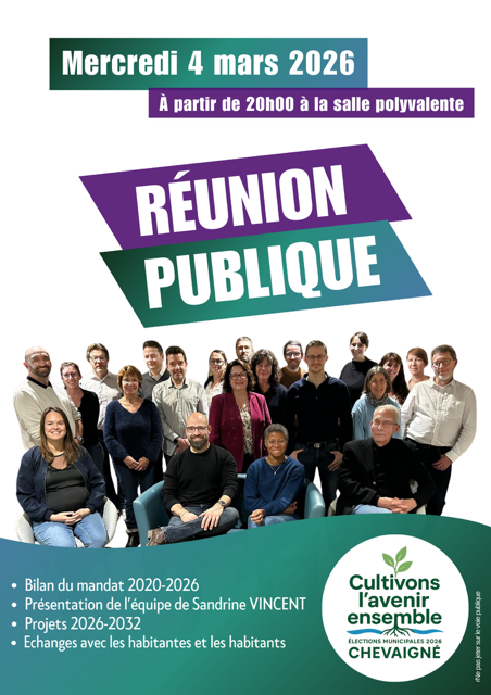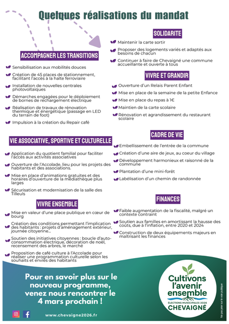 La liste Chevaigné 2026, Cultivons l’avenir ensemble, a pour volonté d’accompagner notre commune vers un futur qui permet à chacune et chacun de se loger, de profiter d’équipements adaptés à ses besoins quotidiens et de créer des liens.